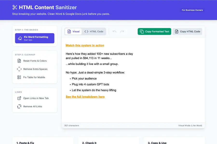 Turn plain text into clean, readable, and well-structured content for social media posts. Fix spacing, line breaks, and formatting with one click.