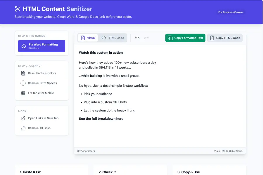 Clean messy HTML copied from emails, websites, or editors. Strip unwanted tags and keep only clean, usable content.